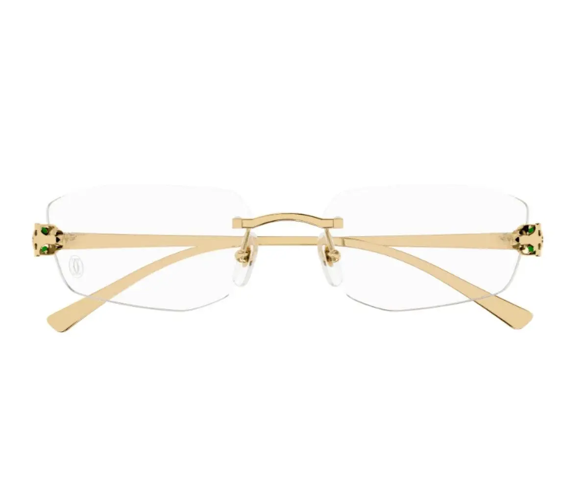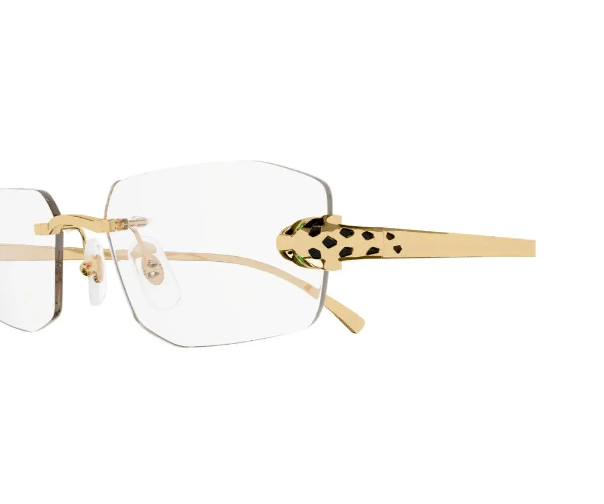 New contemporary and stylish re-vamp aesthetic of Panthère Massai inspired by Cartier’s jewelry. Modern edgy rimless construction with the three-dimensional Panthère head on the front to ensure a stylish, strong and unisex look. The metal temples recall the Panthère head and tail, and it are decorated with precious hand-made enamel spots. Precious finish in gold or platinum.